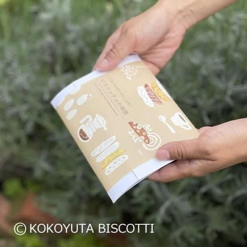 可愛いイラストの掛け紙を巻いた小箱に2種類のビスコッティが入ります。